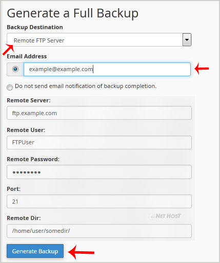 5. Once you fill in the Remote FTP details, click on the "Generate Backup" button.