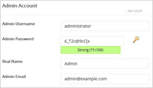 8. Under the "Admin Account" field enter the following information: