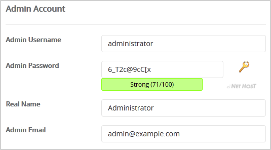 - Admin Username: Your new Nucleus username (for security reason do not use the "Administrator" or the "Admin" username.)