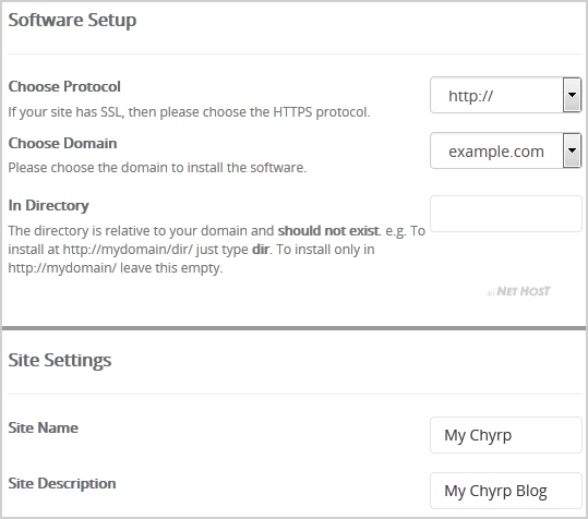 • Admin Username: Your new Chyrp username (for security reason do not use the "Administrator" or the "Admin" username.)